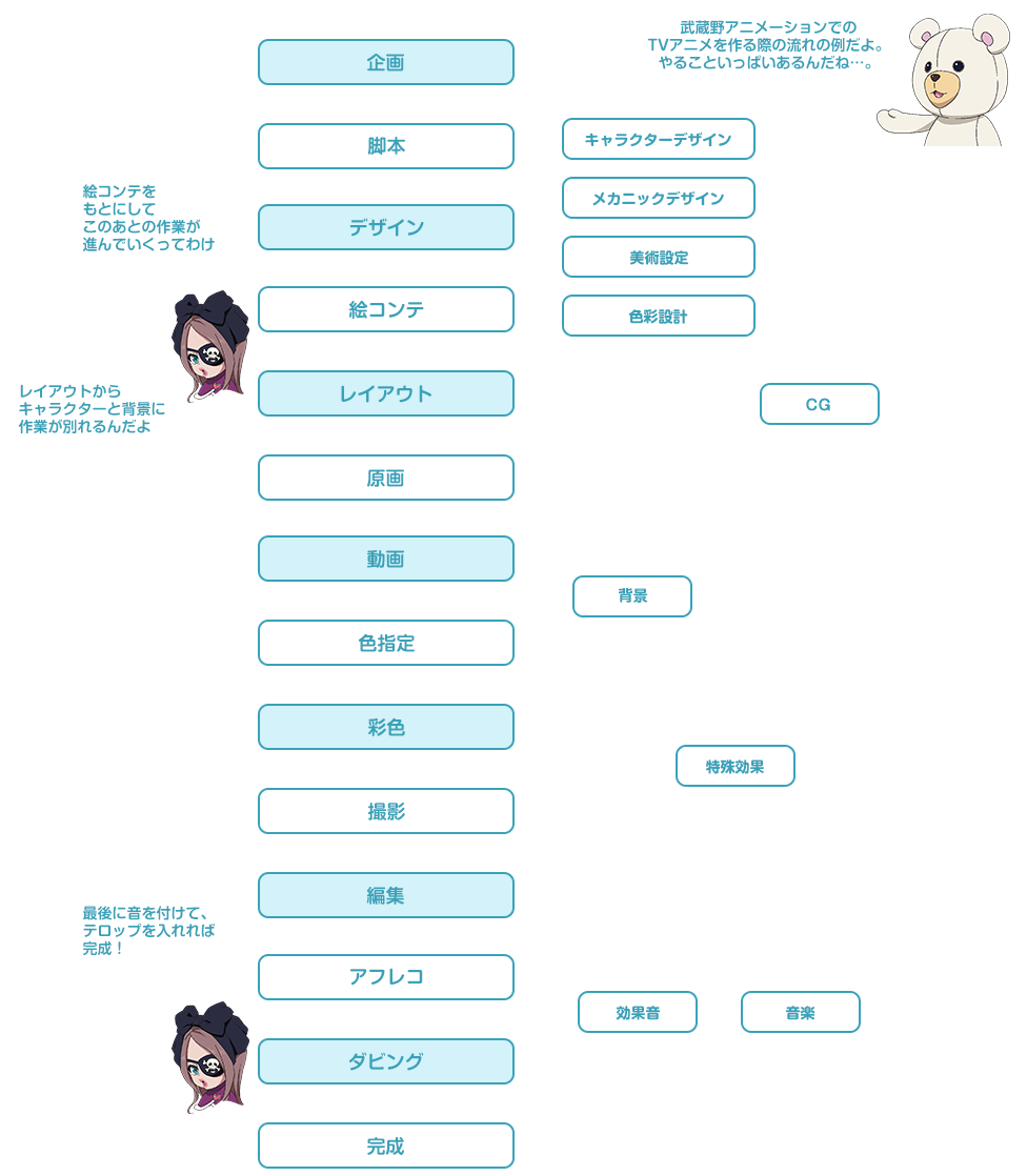 【仕上げ】(公式の工程表では【彩色】)や【撮影】【美術】など
