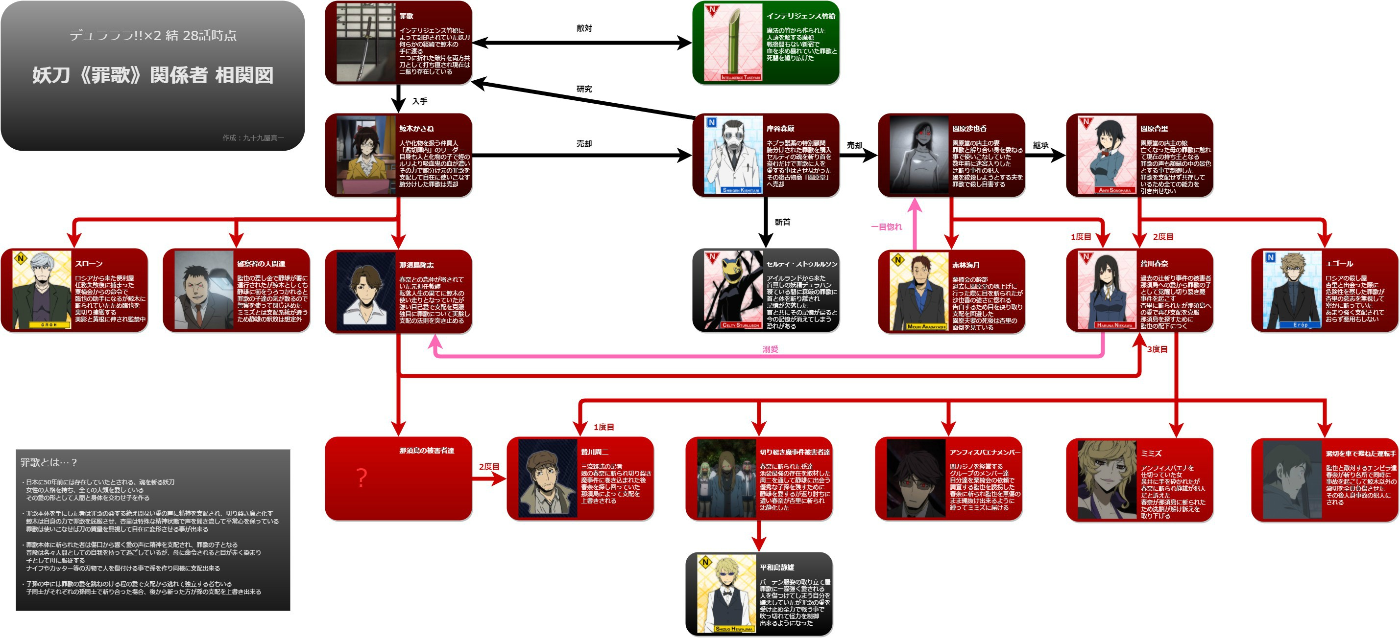 罪歌、首、カラーギャング(+ダラーズ)で、デュラララのおおよその要素・因縁を