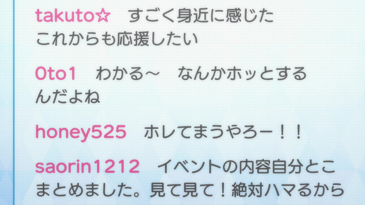 あと、たまきさんが(正論なんだけど)「アイドル失格」という厳しい一言を言うのが意外だったな(普段優しいだけに)