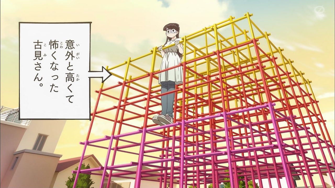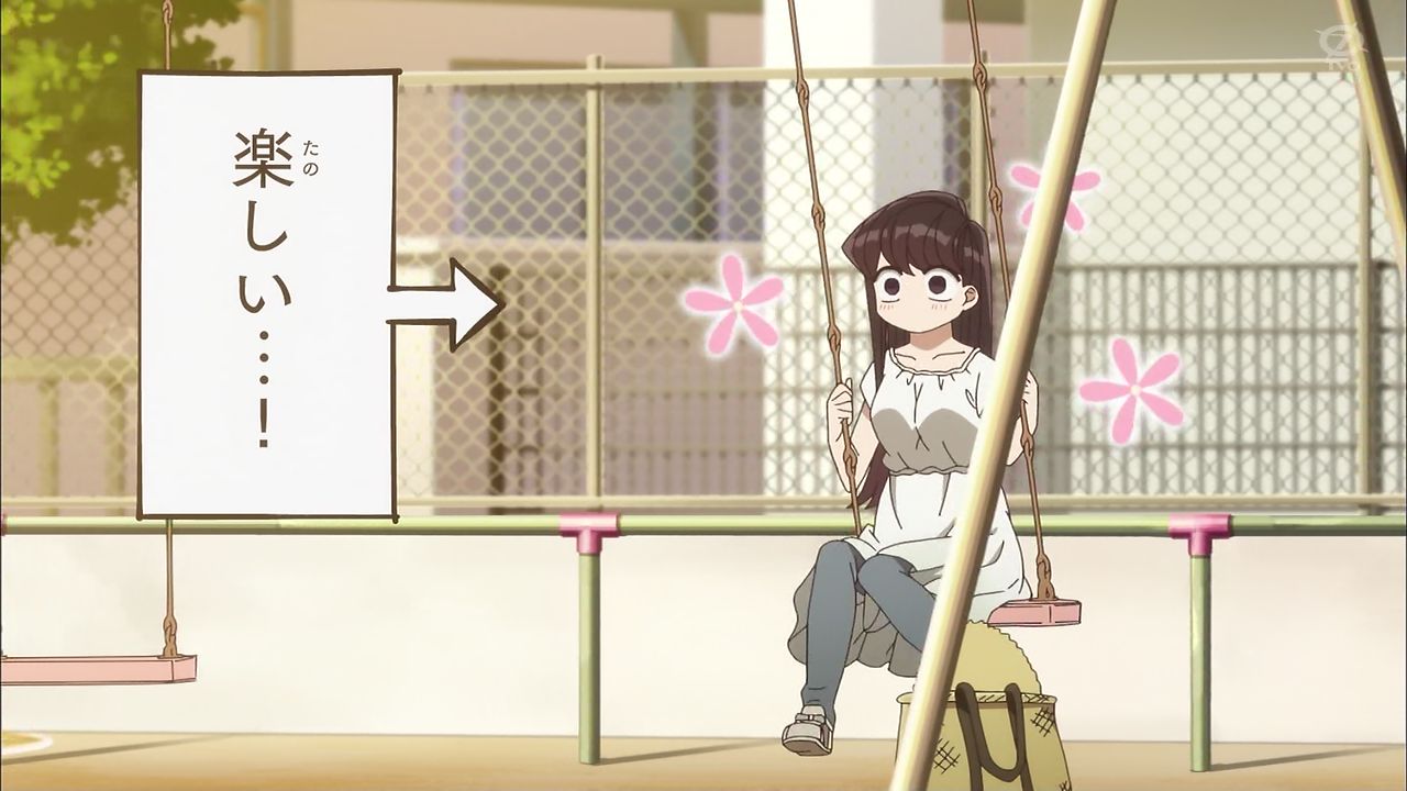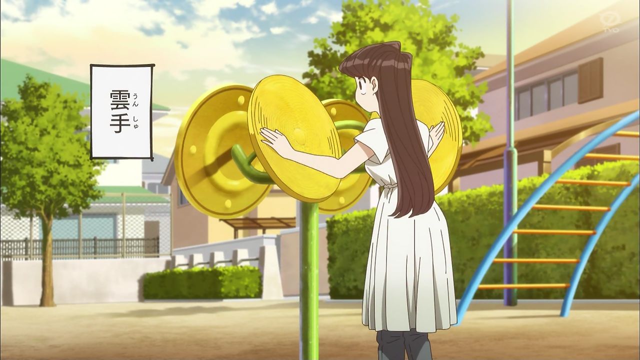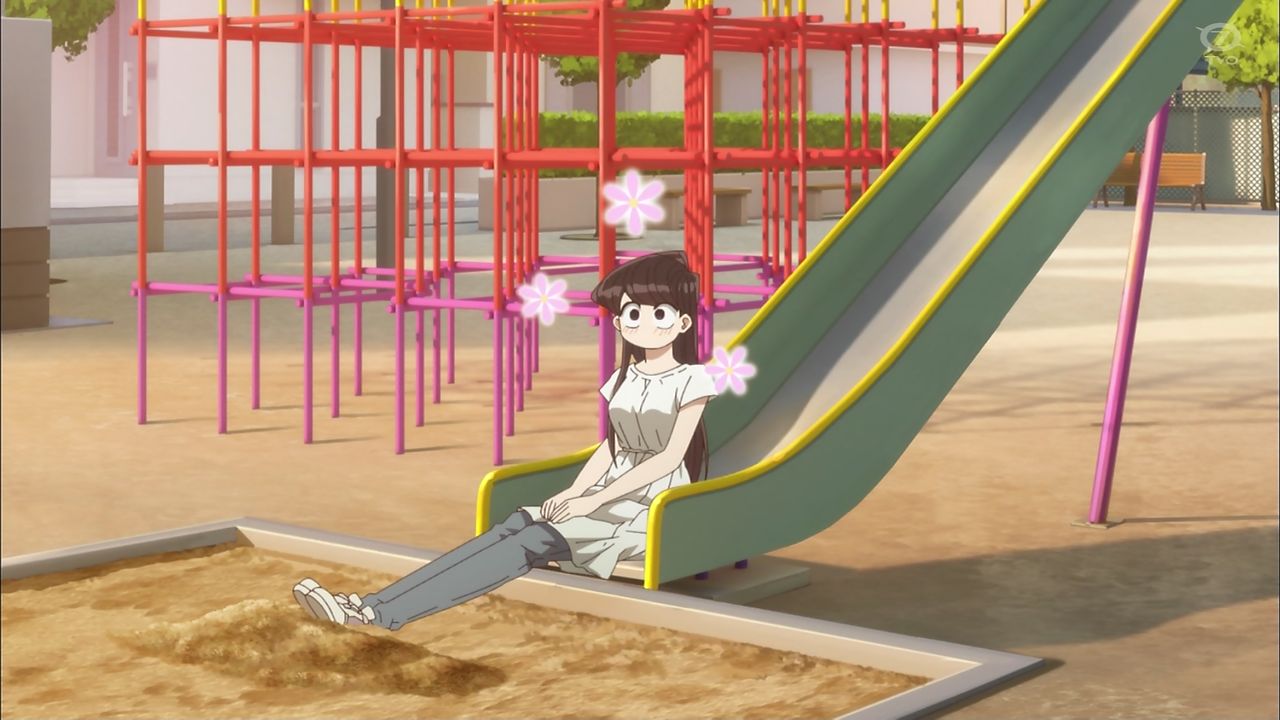 公園の前を通りかかった古見さんは、誰もいないのを確認しつつブランコに乗る。楽しくなってきた古見さんは華麗にブランコからジャンプし着地。滑り台、ジャングルジム、雲梯などこなしていく。