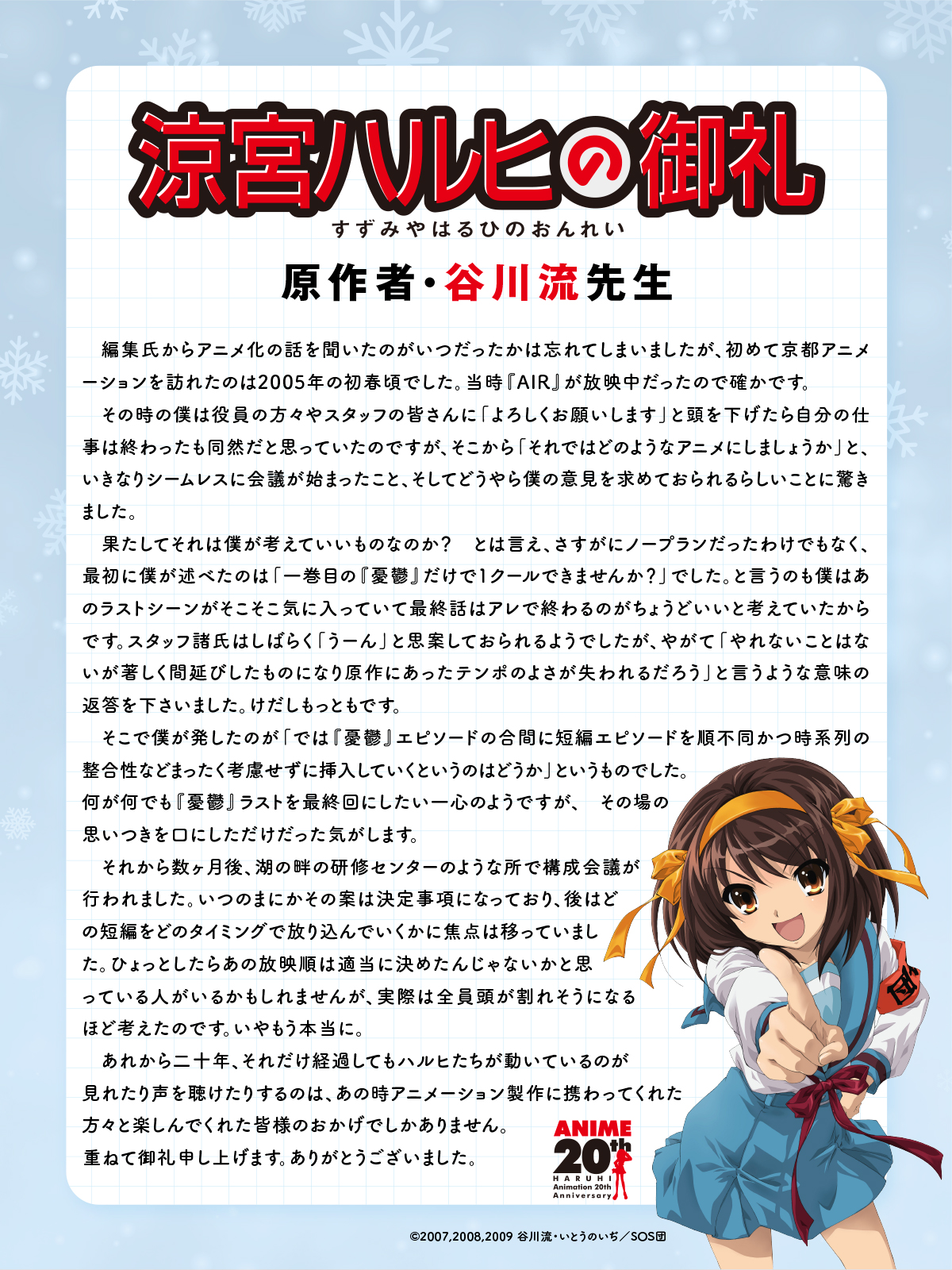 企画始動を記念して原作者・谷川流からのコメント、